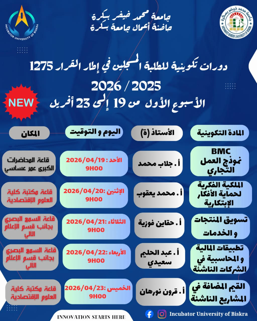 نظرا لحدوث تغيير في أماكن إجراء الدورات التكوينية نعلم الطلبة المسجلين أصحاب المشاريع ان الدورات التكوينية المبرمجة ستكون حسب ماهو موضح في الاعلان المرفق. فالرجاء متابعة صفحة الفيسبوك للاعلان عن أي تغيير.