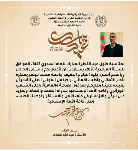 بمناسبة حلول عيد الفطر المبارك للعام الهجري 1447، الموافق للسنة الميلادية 2026، يسعدني أن أتقدم لكم باسمي الخاص وباسم أسرة كلية العلوم الدقيقة جامعة محمد خيضر بسكرة بأحر التهاني وأطيب الأماني، راجيا من المولى العلي القدير أن يعيده علينا وعليكم بموفور الصحة والعافية، وعلى الشعب الجزائري وكافة الأمة الإسلامية بدوام الصحة والهناء، وبمزيد من الرقي والازدهار في كنف الأمن والاستقرار لوطننا الحبيب، وعلى كافة الأمة الإسلامية.