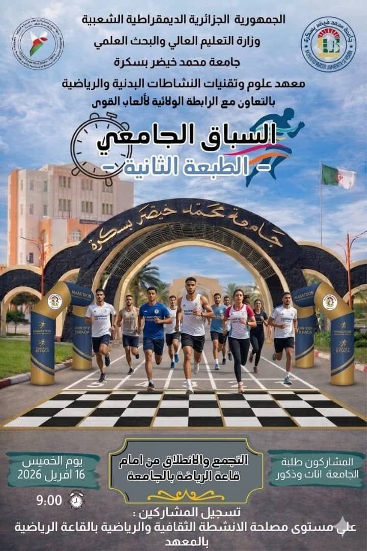 06 نيسان/أبريل 2026 الزيارات: 4 الطبعة الثانية للسباق الجامعي تحت إشراف جامعة محمد خيضر بسكرة ينظم معهد علوم و تقنيات النشاطات البدنية والرياضية بالتنسيق مع الرابطة الولائية لالعاب القوى الطبعة الثانية للسباق الجامعي ذكور وإناث يوم الخميس 16 أفريل 2026.بالتوفيق لطلبتنا الأعزاء.