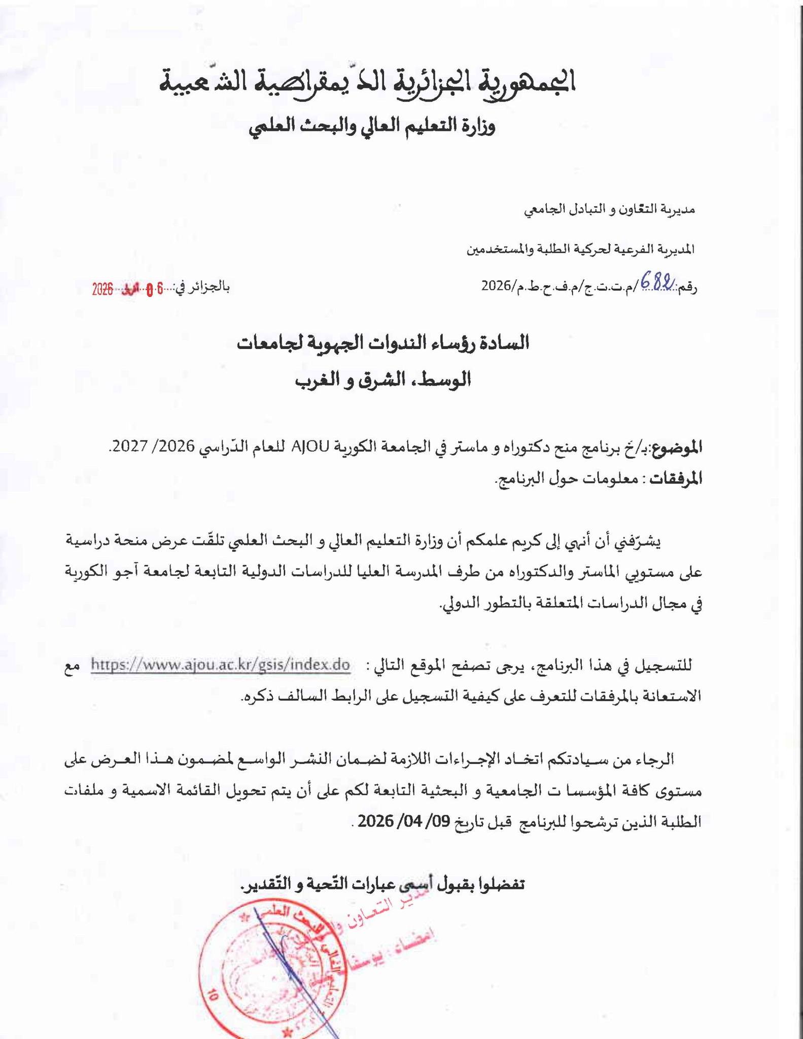 تنهي نيابة مديرية الجامعة للعلاقات الخارجية والتعاون إلى علم كافة طلبة جامعة محمد خيضر بسكرة، الراغبين في مواصلة دراساتهم العليا بالخارج، عن افتتاح باب الترشح لبرنامج المنح الكورية (GKS) للسنة الجامعية 2026-2027، والخاص بجامعة "أجو " (AJOU University)