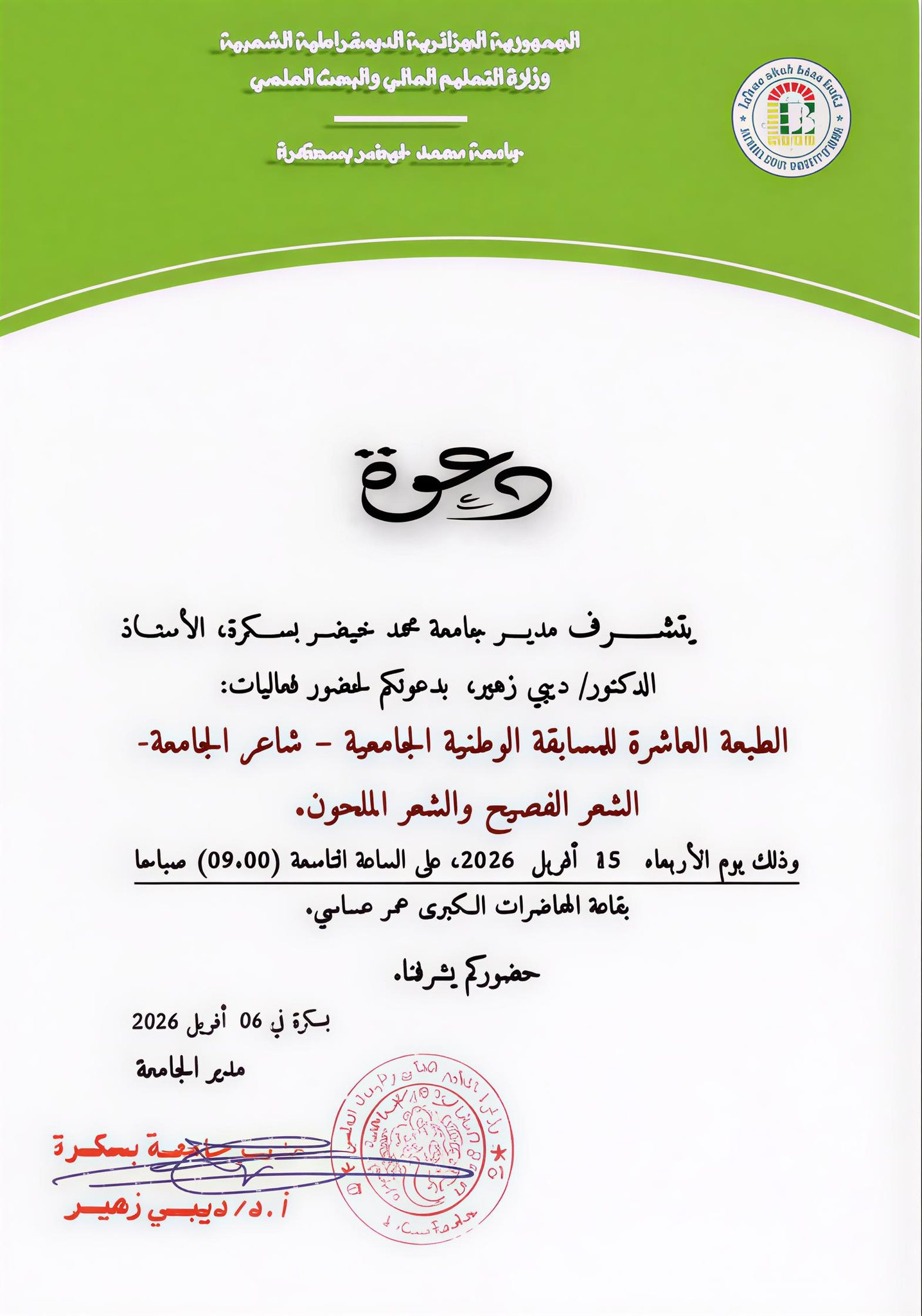 يتشرف مدير جامعة محمد خيضر بسكرة، الأستاذ الدكتور ديبي زهير، بدعوتكم لحضور فعاليات: