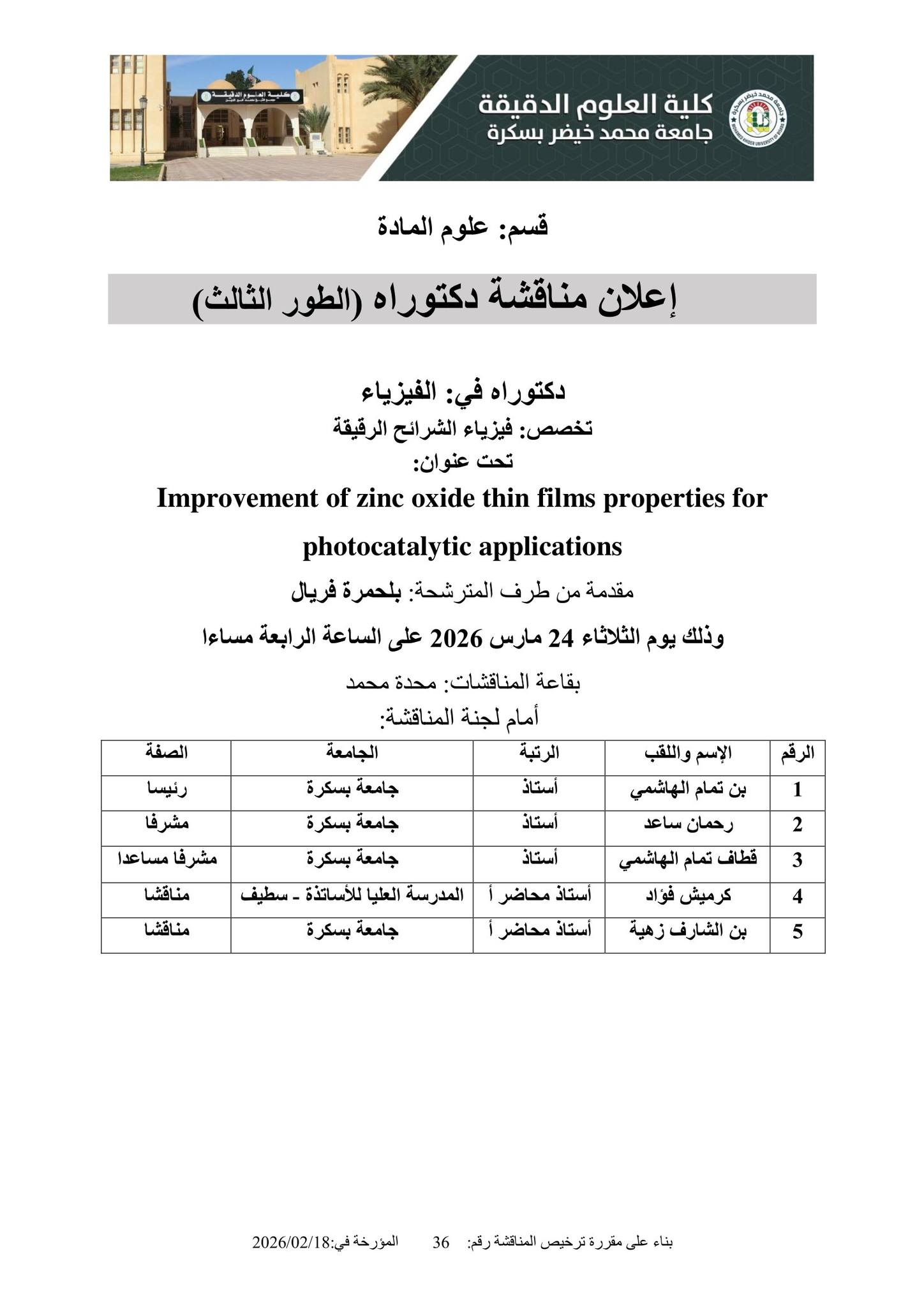 يعلن قسم علوم المادة لكلية العلوم الدقيقة جامعة محمد خيضر بسكرة، عن مناقشة دكتوراه في الفيزياء