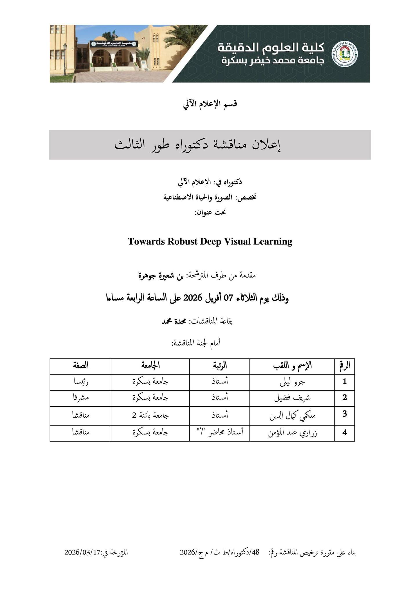 يعلن قسم الإعلام الآلي لكلية العلوم الدقيقة جامعة محمد خيضر بسكرة ، عن مناقشة دكتوراه في الإعلام الآلي